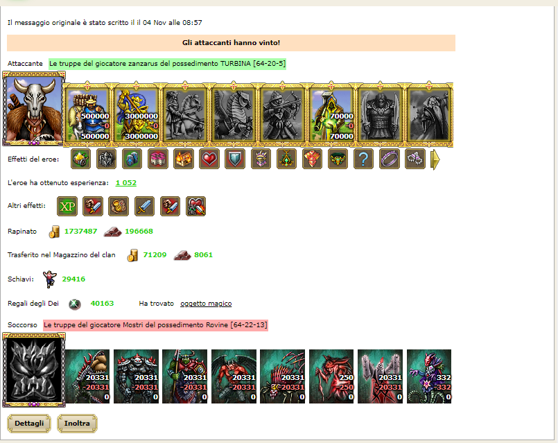 A bordo del mio motorino con l esercito a seguito corsí piú veloce di una mustang verso quella vittoria e con un solo round di battaglia sentendo una furia mai provata sconfissi i nemici. Immediatemente dopo la battaglia una luce accecante mi avvolse lasciandomi una sensazione di soddisfazione e appagamento.